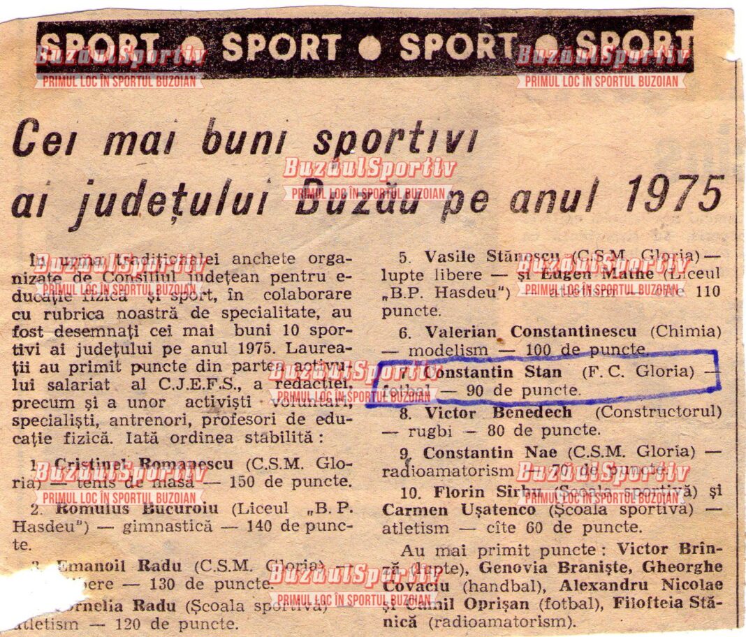 Totdată, Stan a fost singurul fotbalist care a intrat în Top 10 cei mai buni sportivi ai judeţului Buzău. Se întâmpla în 1975, şi Stan se clasa al şaptelea, cu 90 de puncte, după Cristinel Romanescu (tenis de masă, CSM Gloria, 150 de puncte), Romului Bucuroiu (Liceul B.P. Hasdeu, gimnastică, 140 de puncte), Emanoil Radu (CSM Gloria, lupte libere, 130 de puncte), Cornelia Radu (Şcoala sportivă, atletism, 120 de puncte), Vasile Stănescu (CSM Gloria, lupte libere, 110 puncte) şi Valentin Constantinescu (Chimia, modelism, 100 de puncte). “La ora actuală, Stan mi se pare singurul vârf din fotbalul românesc în stare să se ducă spre poarta adversă cu mingea şi doi-trei adversari în spate. E viguros, loveşte balonul la fel de bine cu ambele picioare şi are o dententă de invidiat” – susţinea la vremea respectivă Ion Ionescu, antrenorul buzoienilor, care a promovat Gloria pentru a doua oară în Divizia A (1978/1979).