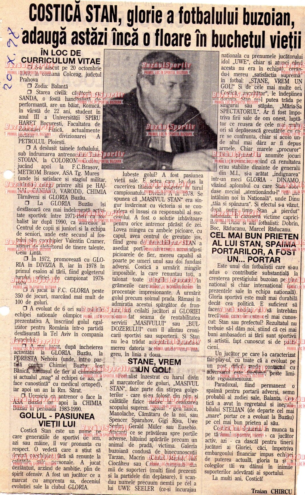 Există sportivi care trec prin fotbal și există sportivi care lasă în urmă o poveste. Costică Stan face parte, fără îndoială, din cea de-a doua categorie, o figură emblematică a Gloriei Buzău, un nume care continuă să răsune în memoria tribunelor. Născut pe 20 octombrie 1949, în comuna Colceag, județul Prahova, sub semnul echilibrat al Balanței, Stan și-a construit viața asemenea stilului său de joc: solid, determinat și imposibil de ignorat. În plan personal, este căsătorit cu Sanda, fostă handbalistă de performanță, iar pasiunea pentru sport a fost transmisă mai departe fiul său, Romică, student la Universitatea „Spiru Haret” din București, antrenor licențiat UEFA, fost jucător la Gloria Buzău și Petrolul Ploiești, în prezent antrenor în cadrul LPS Buzău.