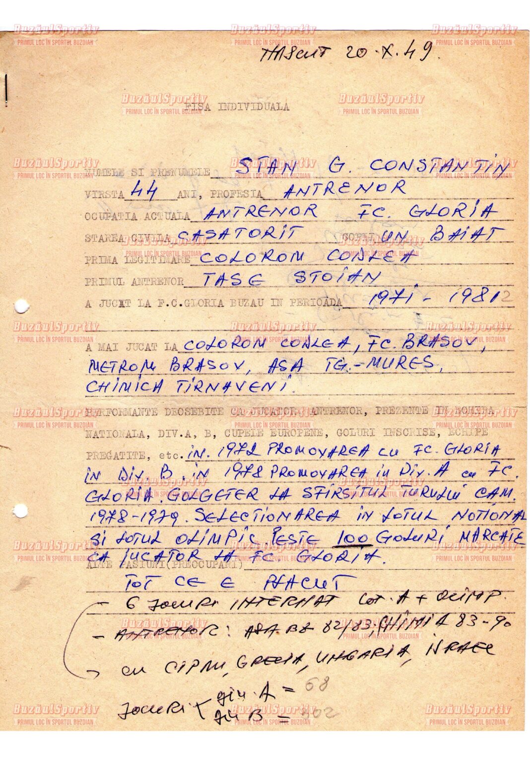 Stan Constantin, poate cel mai important vârf din istoria fotbalului buzoian, a ajuns la Gloria Buzău în 1972, după ce fusese legitimat la una din cele mai mari echipe ale vremii, Petrolul Ploieşti. În cei opt ani cât a jucat pentru Buzău, Stan s-a confundat cu clubul din Crâng. A reuşit cele mai mari performanţe la Gloria şi a marcat peste 200 de goluri în tricolul “glorioşilor”. “Stane, Stane, vrem un gol” strigarea favorită a tribunelor îl făcea pe Stan să înscrie. Determinarea dată de răgetul comun al miilor de suporteri au făcut ca Stan să ajungă în topul golgheterilor, atât pe prima scenă fotbalistică, cât şi în eşalonul secund.